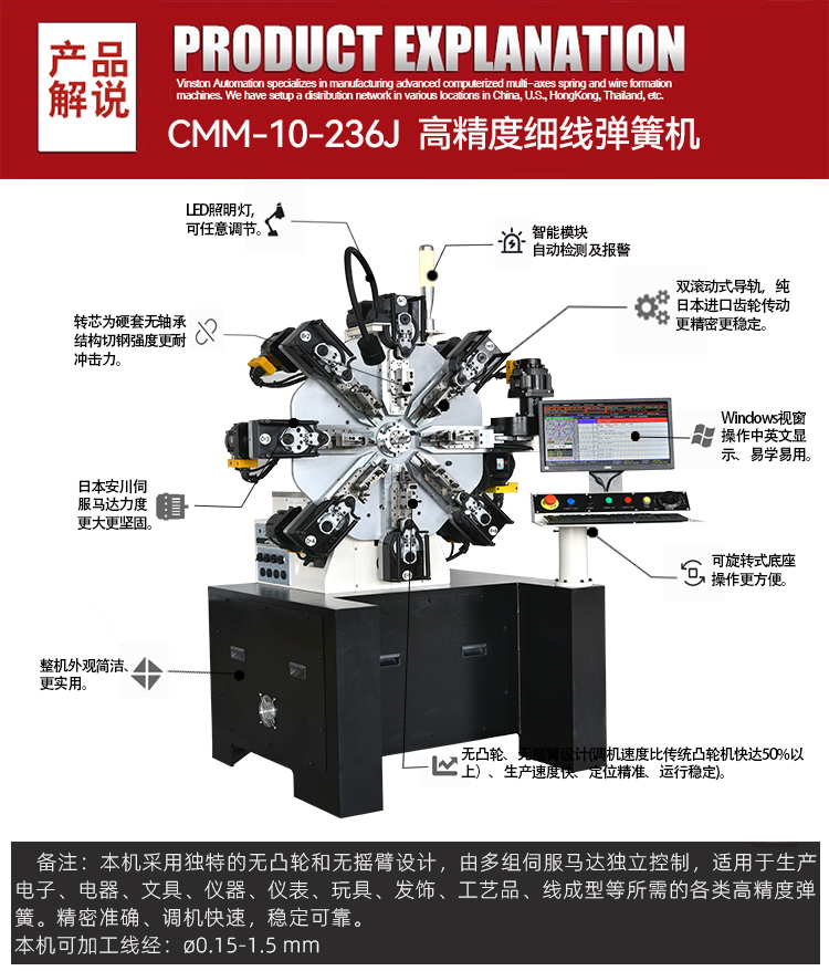 - 产品概述: CMM-10-236J 高精度细线弹簧机 可生产ø0.15-1.5 mm线径弹簧及线成形等)本机采用独特的无凸轮和无摇臂设计,由多组伺服马达独立控制,可以生产各种各样异型弹簧、压簧、双扭簧、电池簧、扁簧(发条簧)及各种线成型等。精密准确、调机快速、稳定可靠。