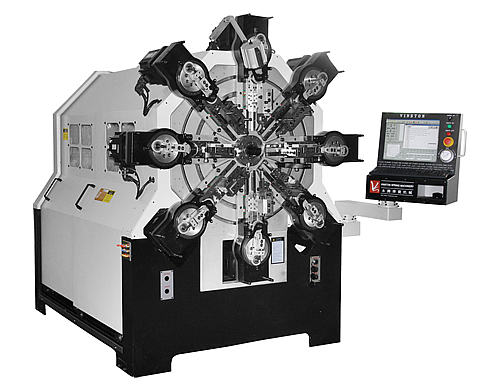 目前市场上的弹簧机主要分为两种:传统凸轮弹簧机和多轴无凸轮弹簧机。凸轮机弹簧机以典型的八爪机为例讲解,虽然八爪机是有八个凸轮爪臂,但是整台弹簧机确只通过两个或者三个大功率电机控制八个爪臂运动,加工产品的时候八个爪臂同时运动。虽然加工产品产品的过程中一般情况下八个爪臂不是同时对产品加工起作用的,但是因为八个爪臂一起运动耗电比较大。无凸轮弹簧机以国内首创多轴无凸轮弹簧机领头羊的永腾为例,永腾弹簧机可以分为10轴和12轴,也就是由10个或者12个小电机单独控制每个手臂。永腾弹簧机外观上看起来也是八个手臂,但是每个手臂都有单独的伺服电机控制,在加工产品过程中,需要每个动作需要用到几个手臂辅助,就只有手臂上的电机耗电,其它的电机就不工作也不耗电。另外,每个手臂都没有凸轮片,调机不需要排凸轮片更简单易学。
