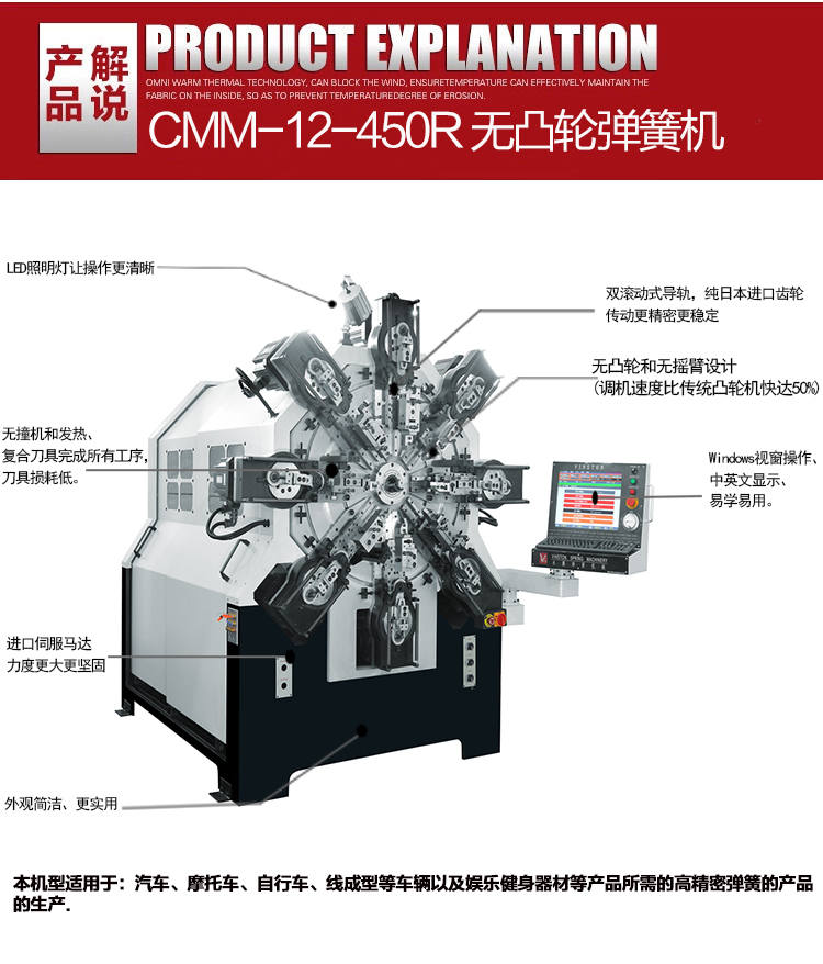 其次,永腾无凸轮弹簧机上无滚动式导轨,可长久保持精度。无撞机和发热,复合刀具完成所有工序,工具损耗低。适用于汽车、摩托车、自行车、线成型等车辆以及娱乐健身器材等产品所需的高精密弹簧的产品的生产.