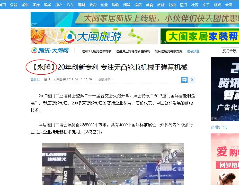 在刚刚结束的2017厦门国际智能制造展”,聚焦智能制造,200多家智能制造的高端企业参展,它们代表了中国智能发展的前沿技术。此次永腾弹簧机械作为国内首家无凸轮兼机械手弹簧机械参加了此次展会。腾讯大闽网也对我公司进行了相关报道详情:http://fj.qq.com/a/20170418/044560.htm