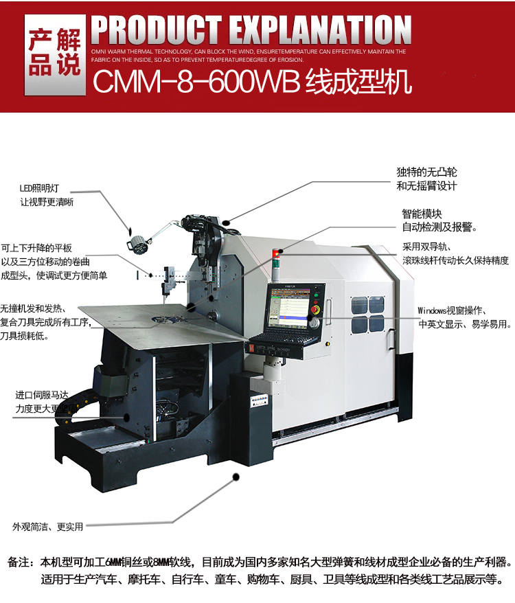 此次参展,乐动官方注册带来的设备有CMM-8-600WB八轴多功能线材成型机、CMM-12-236R转线机、CMM-12-450R转线机,其中CMM-8-600WB八轴多功能线材成型机为此次展品的重头戏。本机全部采用双导轨滚珠丝杆传动,以保证精度和力度。它可以加工4毫米钢丝或6毫米软线,目前成为国内多家知名大型弹簧和线材成型企业必备的生产利器。无撞机发和发热、复合刀具完成所有工序,刀具损耗低。智能模块,还可以自动检测及报警。Windows视窗操作、中英文显示、易学易用。该设备适用生产汽车,摩托车,自行车,童车,购物车,厨具以及各类线成型工艺品展示架等。
