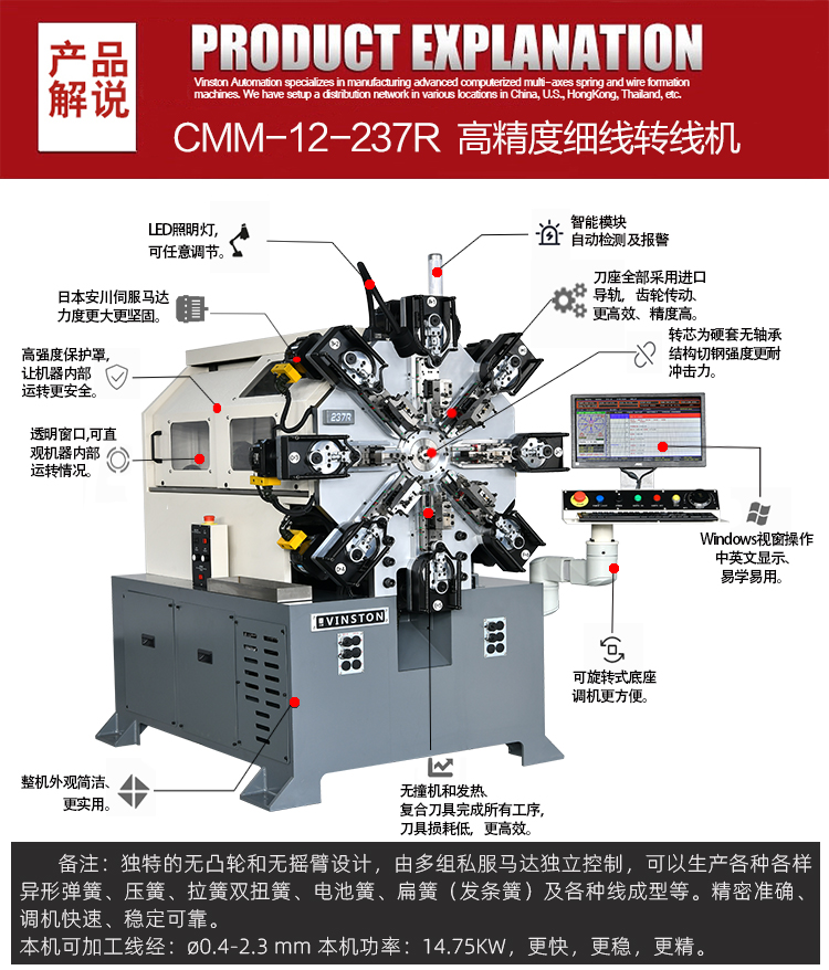 本机型适用于生产电子、电器、文具、仪器、玩具、发饰、工艺品、线成型等高难度精密弹簧,尤其针对各种内(外)双扭簧特别适合。