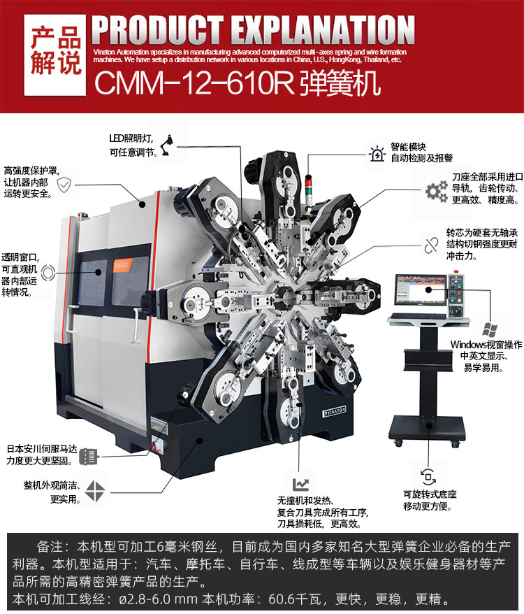 2、拥有传统8工位机械之优点、并兼备1组自由手,可以上下、左右、自由发挥(生产高难度的弹簧、更容易、更快捷、更精确)。