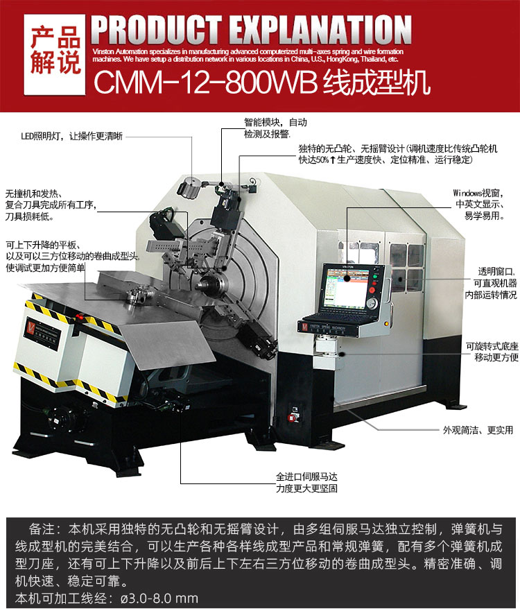 - 产品概述: CMM-12-800WB线材成型机可生产ø3.0-8.0 mm线经线成型)本机采用独特的无凸轮和无摇臂设计,由多组伺服马达独立控制,弹簧机与线成型机的完美结合,可以生产各种各样线成型产品和常规弹簧,配有多个弹簧机成型刀座,还有可上下升降以及前后上下左右三方位移动的卷曲成型头。精密准确、调机快速、稳定可靠。