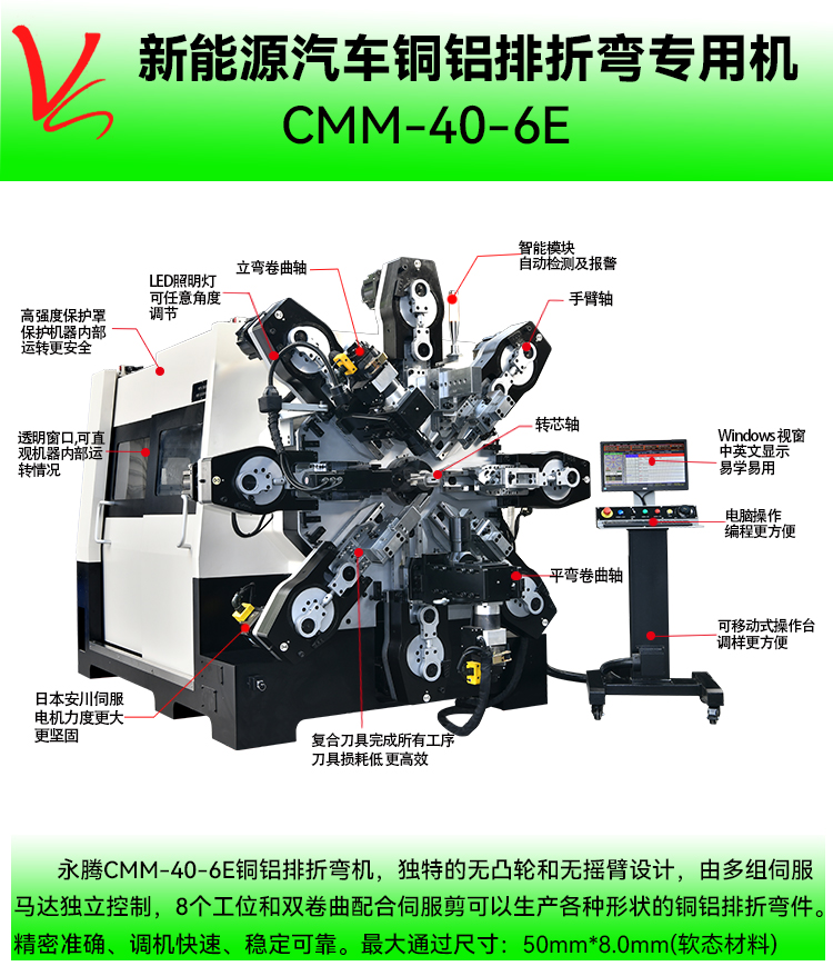 - 产品概述: CMM-40-6E铜排折弯机(最大通过尺寸:50mm*8.0mm)集3D折弯机和弹簧机所有的功能于一体的多功能专用机,本机采用独特的无凸轮和无摇臂设计,由多组伺服马达独立控制,永腾铜排折弯机广泛应用于导电排成型,新能源电池连接排、新能源电池模组、铜母排成型、硬排成型、导电排、电池连接排、铜排、裸排成型等。精密准确、调机快速、稳定可靠。