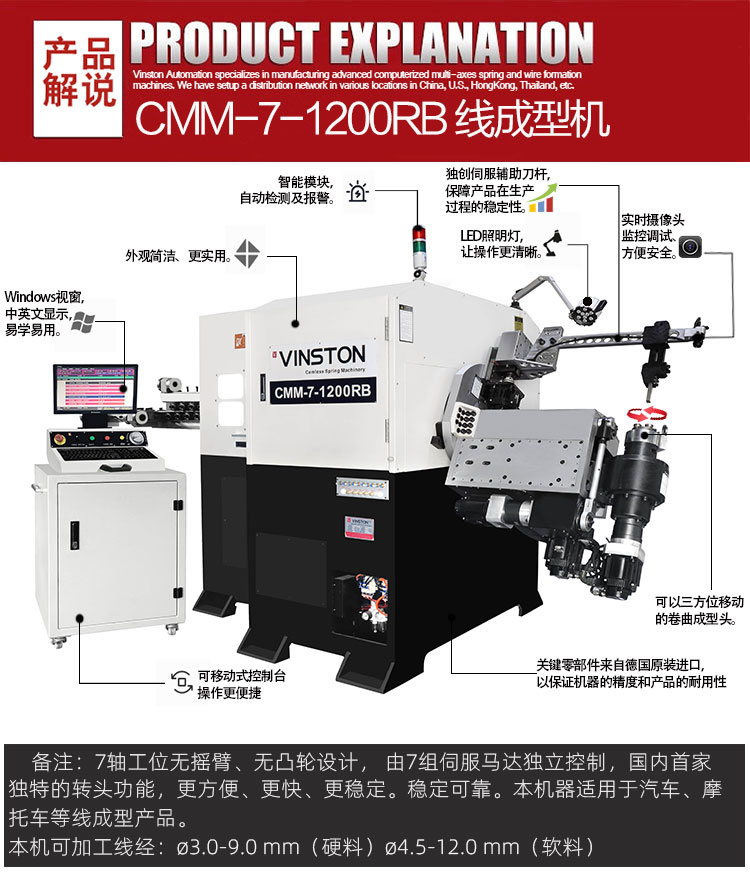 - 产品概述: CMM-7-1200RB线材成型机可生产 ø3.0-9.0 mm线经,铁线或者低碳钢可做ø4.5-12.0 mm线经线成型),本机专业生产汽车零部件等线成型,特别适合做大杆件汽车五金线材成型产品7轴工位无摇臂、无凸轮设计, 由7组伺服马达独立控制,国内首家独特的转头功能,更方便、更快、更稳定。稳定可靠。
