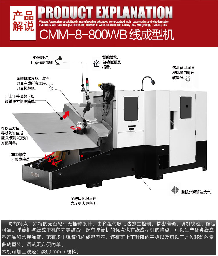 - 产品概述: CMM-8-800WB 线材成型机可生产ø8mm(硬料),本机专业生产汽车零部件等线成型,特别适合做大杆件汽车五金线材成型产品带平板的线材折弯成型机,既具备精密弹簧机的精度,又超越普通线成型机的速度,生产汽车零部件和厨卫五金制品以及其他日用五金制品非常适合。具有设计直观,调试方便,速度快的亮点。