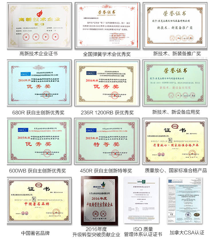 资质证书:永腾弹簧机系列机型现已获国内外专利局多项实用型专利。