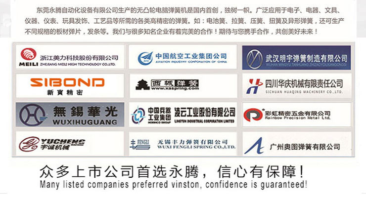 本公司生产的无凸轮电脑弹簧机实用性强,效率高,易学易用。适用于汽车、电子、电器、文具、仪器仪表、玩具饰、工艺品、家庭五金用品等所需的各类高精密的弹簧及线材成型,如:拉簧、压簧、扭簧及异形弹簧,还可生产不同规格的板材弹片,发条等。