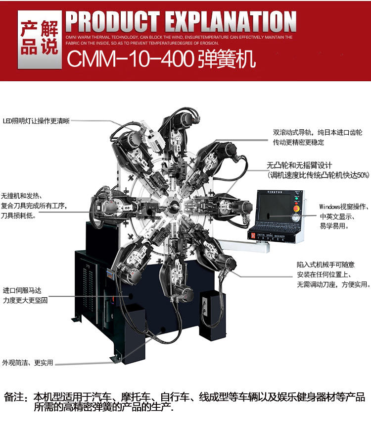 独特的无凸轮和无摇臂设计,由多组伺服马达独立控制,可以生产各种各样异型弹簧、压簧、双扭簧、电池簧、扁簧(发条簧)及各种线成型等。精密准确、调机快速、稳定可靠。